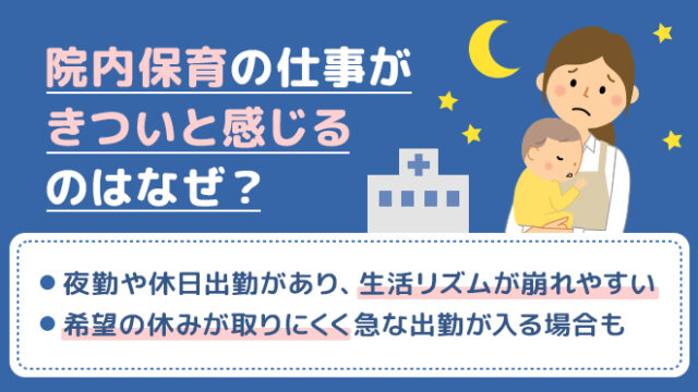 保育ノウハウ 院内保育の仕事がきついと感じるのはなぜ? 理由と対処法、転職も視野に 2025年6月26日 保育のお仕事レポート https://hoiku-shigoto.com/report/wp-content/uploads/2019/02/02.png 保育のお仕事レポート